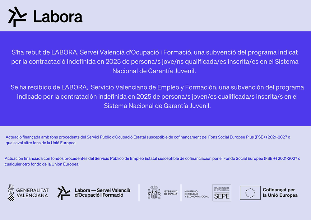 WonderBits is beneficiary of the AVALEM JOVES 2025 program, co-financed by the European Social Fund with the expedient ECOGJU/2025/465/46, for the indefinite hiring of qualified young people, from the Valencian Employment and Training Service, with the amount of € 12.500